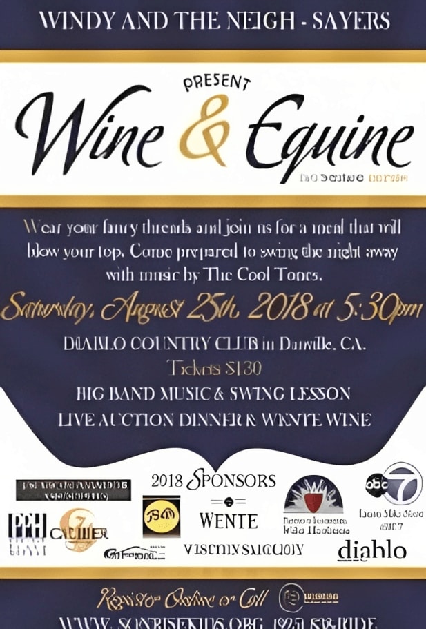 On Saturday August 25th at 5:30pm at the Diablo Country Club will be our annual Wine and Equine dinner fundraiser.